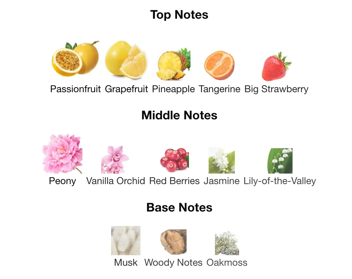 Heart Notes: Rose: Peony, Vanilla Orchid, Red Berries, Jasmine,